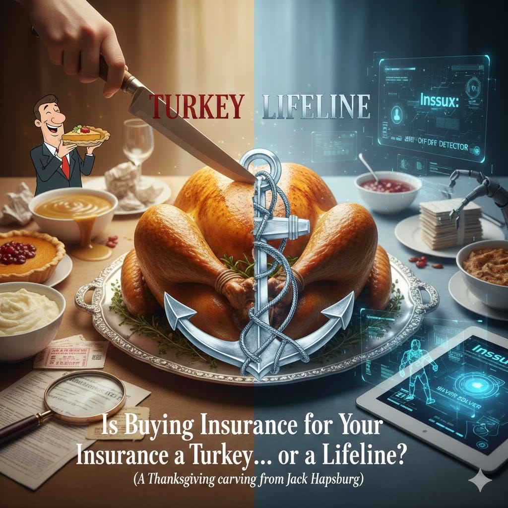 But here’s the good news: the days of “pray you have the right coverage” are ending. At Inssux, we’re building the tools that drag all this nonsense into the daylight. The Rip-Off Detector is in development right now — a simple, free analysis that tells you if your policy has holes big enough to swallow your Thanksgiving leftovers. And coming right behind it is the Silver Solver, our AI claims warrior built to challenge denied or lowballed claims with machine-precision and Jack-approved attitude. Thanksgiving is about gratitude — so be grateful you won’t have to navigate this insurance madness alone much longer.