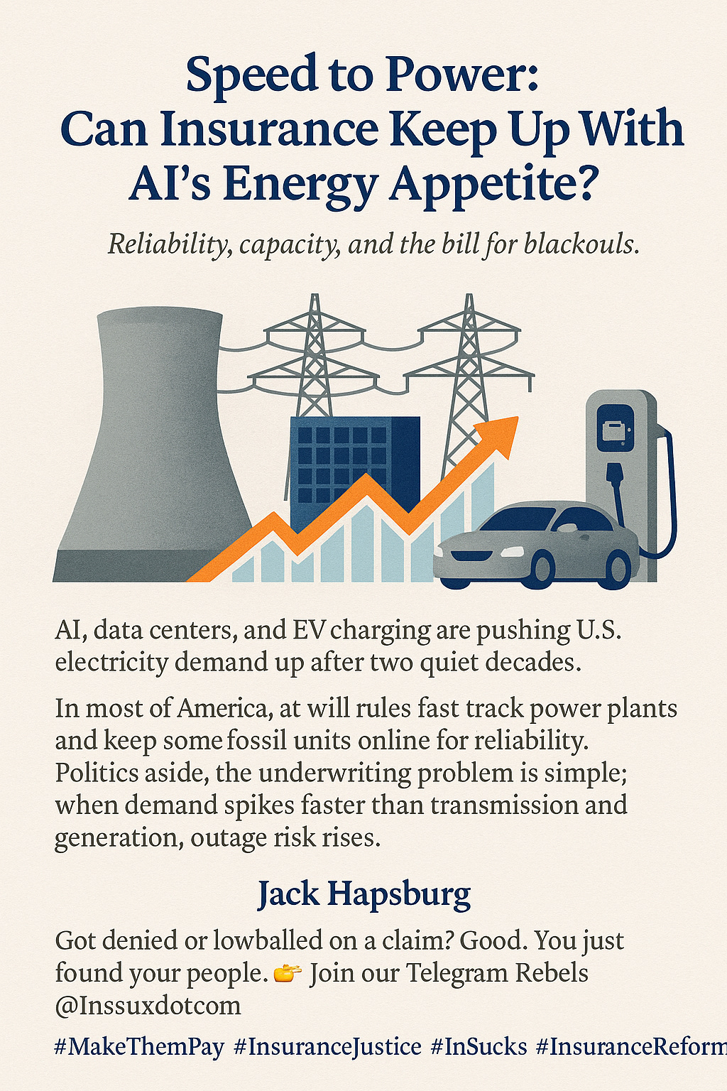 AI, data centers, and EV charging are pushing U.S. electricity demand up after two quiet decades. The government now wants to fast track power plants and keep some fossil units online for reliability. Politics aside, the underwriting problem is simple: when demand spikes faster than transmission and generation, outage risk rises.